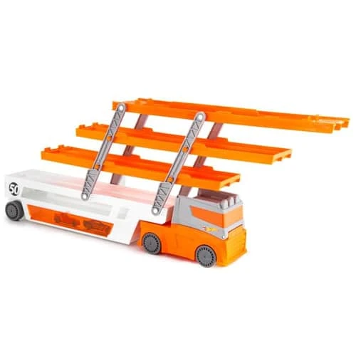 The Hot Wheels Mega Hauler is a big rig for big adventures with endless storytelling possibilities. This massive hauler can be loaded with up to 50 cars in its six expandable levels and that’s just the beginning! At the back of the hauler there is a ramp that comes down to connect to Hot Wheels City sets. The cab of the rig opens with space to park 2 more vehicles and the cool transparent side panel opens so kids can store their favourite rides in a special spot. Connect the Mega Hauler to Hot Wheels orange track and roll cars right into a side-by-side race for traditional track play, too!