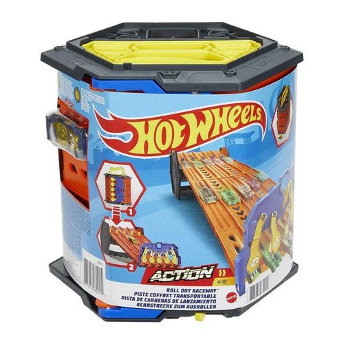 The Hot Wheels Roll Out Raceway Track Set is the ultimate in racing and storage in one cool and exciting package! When it’s compressed, the Hot Wheels Roll Out Raceway serves as a convenient and portable storage container that can hold up to 80 die-cast cars and five track pieces. Unsnap it and reveal a 5-lane racetrack play set for multi-car competition. Up to five cars can compete at once, and with the fair starter mechanism, no one gets an unfair advantage. The winning car releases its numbered gate, which will appear in a window above the finish line, so there’s no more too-close-to-call races! Includes one 1:64 scale Hot Wheels vehicle. Colours and decorations may vary.