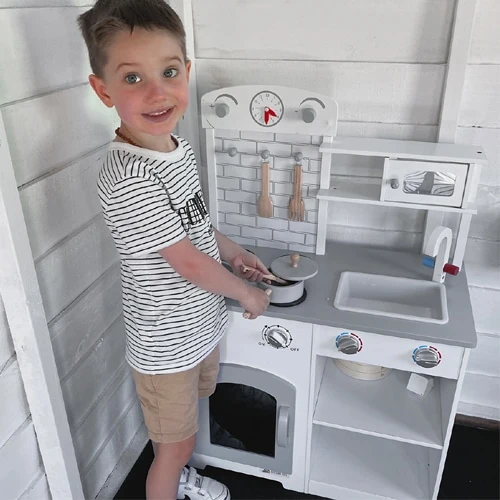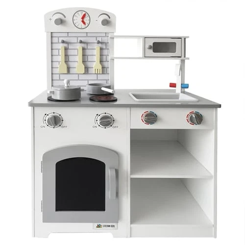 - Indoor play kitchen with play sink, cook top, oven, storage, utensil hanger and clock