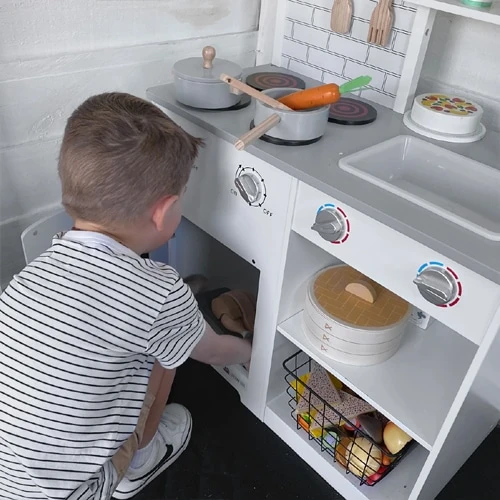 Yummy! Something smells good in the kitchen. The Piccolo Play Kitchen lets little cooks play pretend and bring imaginative creations to life. Bake in the oven, boil and grill on the hotplate, and heat up in the microwave. Play chef right away with pots, pans, and utensils.
