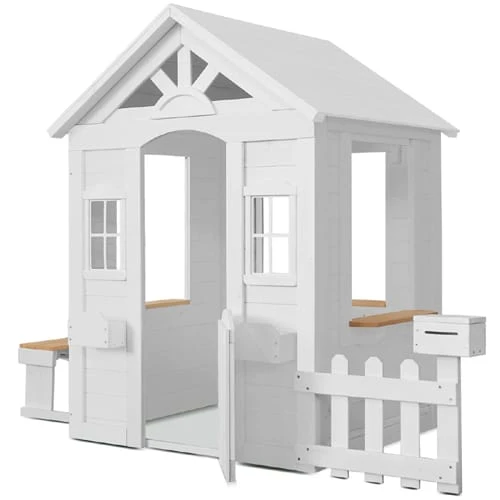 Painted white, with timber accents. And, decorated with quaint features like windows, flower planters, picket fence, and a mail box to provide endless fun for your little one.