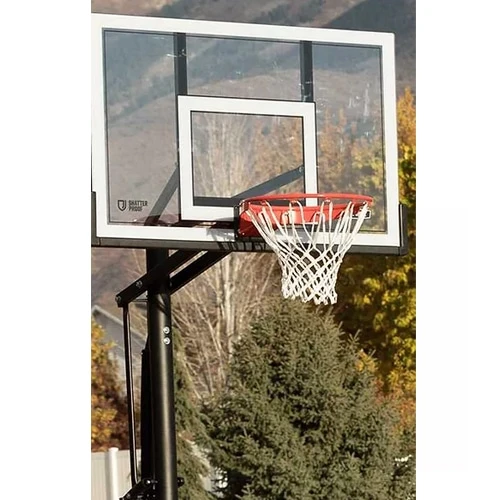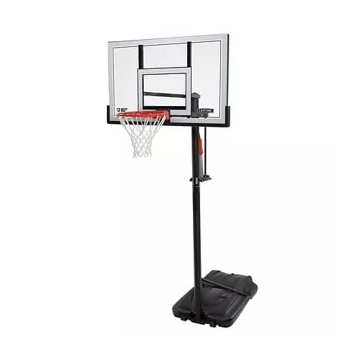 This portable basketball system from Lifetime Products features a 54 in. Steel-Framed Shatter-Proof regulation target backboard with a Power Lift height adjustment mechanism that adjusts from 7.5 to 10 feet high in infinite height increments. It also includes a Slam-It Pro rim with an all-weather nylon net and a 3.5 in. diameter round steel pole. With a 35-gallon portable base, this system can easily be moved to a desired location. So bring the arena to your home with a residential basketball system from Lifetime Products.