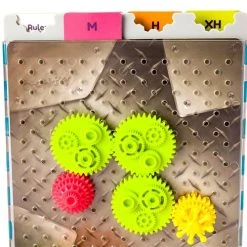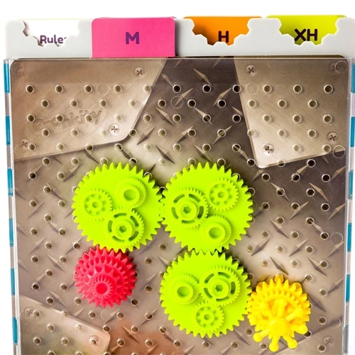 Get your brain cranking! The object is simple: build a puzzle solution between the red gear and the yellow wheel. When the gear teeth interlock, you’ll be able to turn the wheel and send the whole contraption spinning! Start by choosing a puzzle of your choice (there are four levels of difficulty so the whole family can play!). Slide the card under the clear grid, then place the red gear and yellow wheel as indicated. Each puzzle will show you an array of colors and sizes of gears, and how many of each you’ll need (you’ll see them printed along the bottom of the card). Pull those out (you MUST use all of them!). Now: solve that puzzle! Think you’ve solved the puzzle? Give the yellow wheel a turn and see if your contraption spins! If the red gear spins along with all of the gears you MUST use, you have just engineered a solution to the puzzle! If not, return to your design board and give your problem-solving skills another whirl!