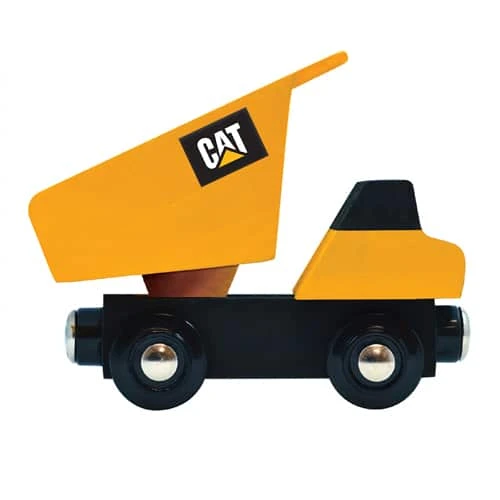 This MasterPieces Caterpillar Dump Truck Train features a wooden toy train that looks and works like a dump truck! This magnetic CAT Dump Truck Train is compatible with most 1 Inch wooden train tracks, and is the perfect gift for all kids, ages 3 and up! It also has a working dump bed that tilts!