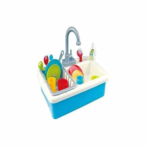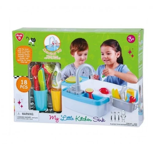 MOTORIZED PUMP. Pull the lever down to release real water for washing dishes! Includes a dish drainer and worktop for easy clean up!